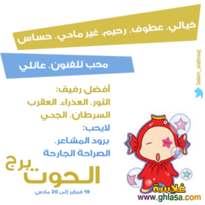 توحي، عزيزي الحوت ، بالحب في هذا العام المليء بالاحتمالات والوعود والإغراءات الشخصية. قد يكون النصف الثاني مسرحاً لانتعاش جديد وانطلاقة أكثر وعداً. عائلياً، تهتم بأحد الوالدين وتحاول أن تصوِّب سلوك أحد الأولاد أو المقرَّبين. تتغيّر ظروف تسمح لك بالتحرّر من بعض القيود